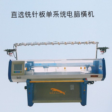 单机头单系统,该系列为无起底板装置的全自动电脑编织横机,采用数字化技术、实现横机的翻针、吊目、挑孔、提花、明收针及其他规格花型编织功能。可编织基本织针组织,适用于真线,绢丝,合纤丝,羊毛,腈纶,混纺,纱线等原料编织毛纱成衣,围巾,帽子及服装附件。